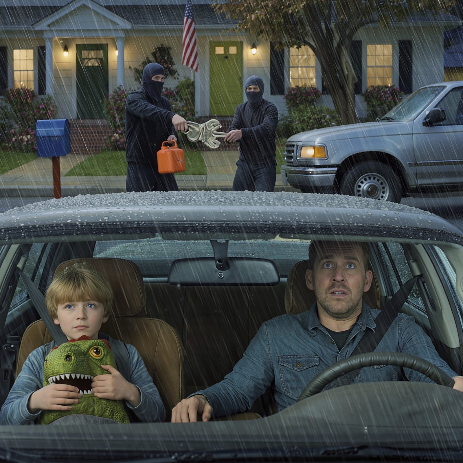 He knew something I didn’t. When we pulled into our driveway, the suburban quiet had been replaced by something out of a fever dream. Two men in balaclavas were standing in the downpour, holding a gas can and a massive, archaic key.